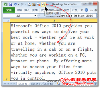 1. 首先,将需要进行朗读的英文文本复制粘贴到Excel单元格中,单击快速访问工具栏中的【朗读单元格】按钮,此时,便可以通过连接好的耳麦或音响设备,听到清晰的朗读声,如4所示。