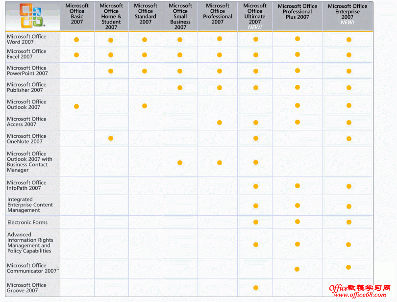 Microsoft Office Enterprise 2007推出已经很久了,一直用Office 2003,主要因为太新版本使用起来有点麻烦,就是大家习惯的保存最新格式文件,如果发送给其他人经常出现打不开,还要进行再次低版本转化保存。 下面看一下, Microsoft Office 2007各版本功能有哪些差异,Office 2007共分企业版、专业版、标准版、旗舰版等版本,功能列表如下: