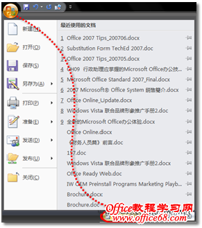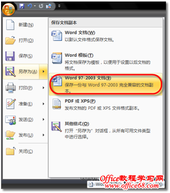 图1 另存为兼容格式文档 但是,如果这样每次将文档都另存一遍,对于Microsoft Office 2007用户而言并不是一件很轻松的事情,因此,我们还可以在Office 2007应用程序中设置默认的文档存储格式,操作步骤如下: (1) 在Word、Excel或PowerPoint 2007应用程序中(在此以Microsoft Word 2007为例),单击【Office按钮】,并单击【Word选项】 按钮,如图2所示。