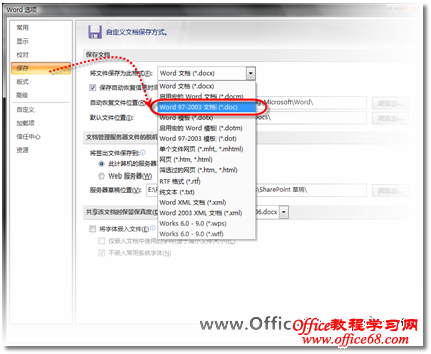 图2 Word选项 (2) 打开如图3所示的“Word选项”对话框后,单击左侧命令导航中的【保存】按钮,在“保存文档”选项区域的“将文档保存为此格式”的下拉列表中,选择“Word 97-2003文档”选项。