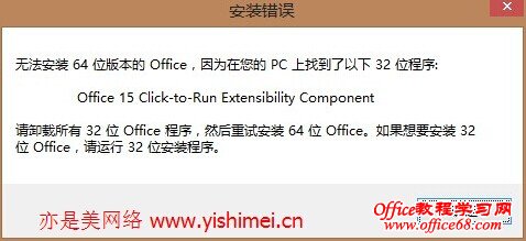 今天在帮助一个同学安装office2013 64位版本的时候,出现“无法安装64位版本的Office,因为在您的PC上找到了以下32位程序:Office 15 Click-to-Run Extensibility Component ,请卸载所有32位Office程序,然后重试安装64位Office。如果要安装32位Office,请运行32位安装程序”,出现这种情况的原因大多出现在预装系统并且自带有office的电脑上,比如带有预装系统的品牌机或笔记本等,今天亦是美网络就写个解决教程出来,以便帮助更多的同学解决这个问题。