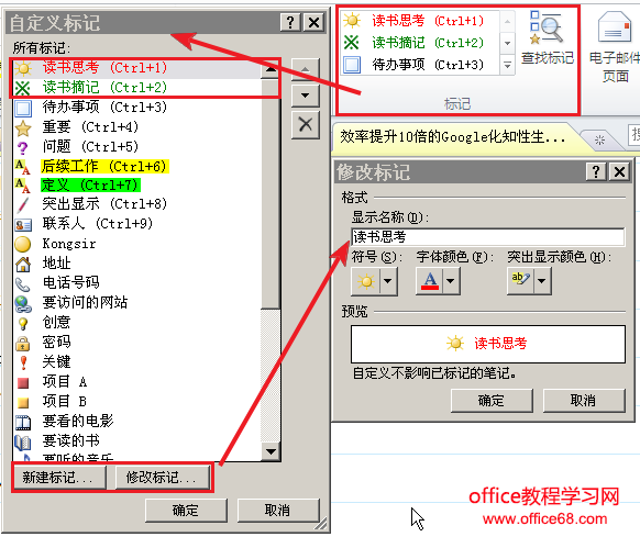 2. 设置标记:我自定义了两个标记:一个是读书思考,用小太阳作图标,用红色字体。因为自己的想法很棒,要闪耀,所以用小太阳和红色字体来鼓励自己。而读书摘记,就是摘抄的原文,用星号,绿色的,因为从小老师就教读书可以打星标,并且绿色好吸收啊。把读书思考排到第一位,因为我的想法才重要。把读书摘记放到第二位,这样到看书的时候你按下Ctrl+1和Ctrl+2就可以很容易地插入星标了。如下图所示