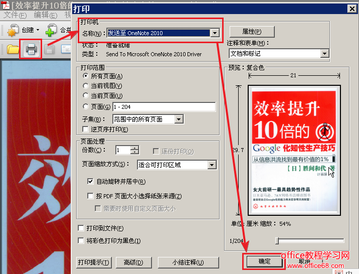 1. 打开你要看的PDF格式的电子书。把它打印输入到OneNote,如下图所示
