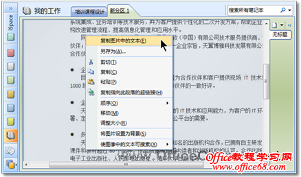 2)将该图片文件复制到OneNote中的任意一个笔记页中,然后,用鼠标右键单击该图片,并执行快捷菜单中的【复制图片中的文本】命令,即可将图片中的文字内容复制到Office剪贴板中,如图2所示。