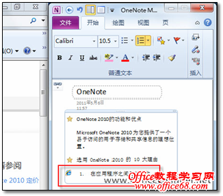 OneNote 2010中,通过单击“快速访问工具拦”中的【停靠到桌面】按钮,可以轻松地将OneNote笔记本窗口停靠到桌面的一侧,从而便于您随时记录笔记信息,以及信息源。