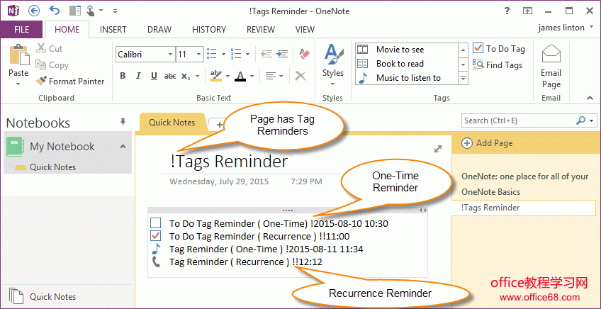在 OneNote 提醒工具中显示的标记提醒 在提醒工具中将罗列出标记提醒,其中将可以区分是一次性提醒还是重复提醒。