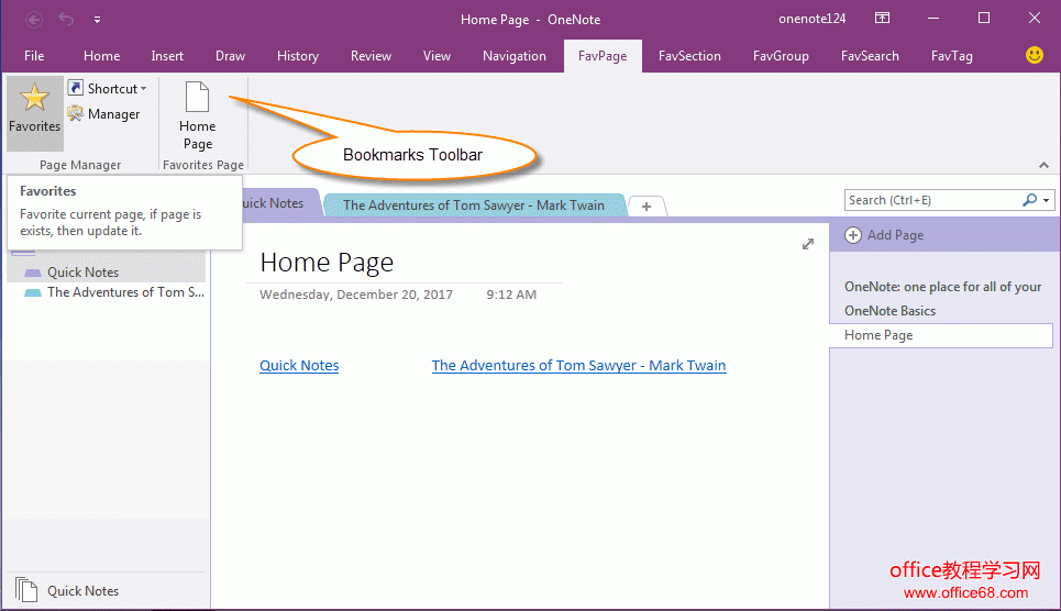 在使用浏览器时,我们一般都希望收藏有自己关注的网站链接。以方便重复打开这些网站。尽管浏览器已经提供了收藏文件夹,但久了之后,我们更希望有自己的浏览器首页。即,在打开浏览器时,就显示我们自己的首页。(不少浏览器已经加入了首页功能) 同样,OneNote 由于收藏的内容多了,同样希望有收藏栏,也希望有我们自己的首页。