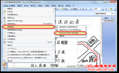 图1 OneNote中的手写内容 在OneNote 2007中,打开需要导入到Word中的笔记页,然后,执行菜单栏中的【文件】|【发送至】|【Microsoft Office Word】命令(如图2所示),即可将手写内容转换为标准的文本并发送到Word中,这样就可以对其进行相关排版、打印等操作了,如图3所示。