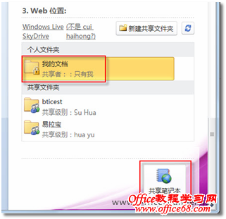 图3 输入ID和密码 5. 登录成功后,在OneNote的后台视图中即可看到SkyDrive中的相关文件夹,从中选择一个文件夹,或者单击【新建共享文件夹】按钮进行新建。此处,我们共享的笔记本属于个人所有,所以,可以选择“我的文档”文件夹,然后单击【共享笔记本】按钮,如图4所示。