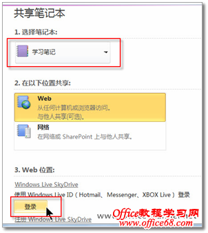 图1 共享视图 3. 在“共享笔记本”选项区域中,确保当前选择的笔记本是要进行共享的笔记本,再将共享位置设置为“Web”,然后单击“Web位置”中的【登录】按钮,如图2所示。