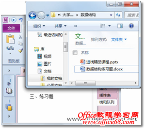 1. OneNote电子笔记本中,定位到需要添加附件文档的页面中,然后再打开Windows资源管理器,并导航到课程文档所在的文件夹中。适当调整两个窗口的大小和位置,以使它们在桌面中均可见,如4所示。
