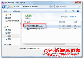 2. 在随即打开的“选择要插入的一个或一组文件”对话框中,浏览找到需要的课件文档并选中它,然后,单击【插入】按钮,如2所示。