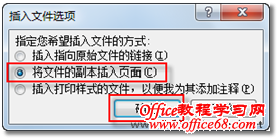 图6 释放鼠标 4. 在随即打开的“插入文件选项”对话框中,选中“将文件的副本插入页面”单选按钮,然后单击【确定】按钮,如图7所示。