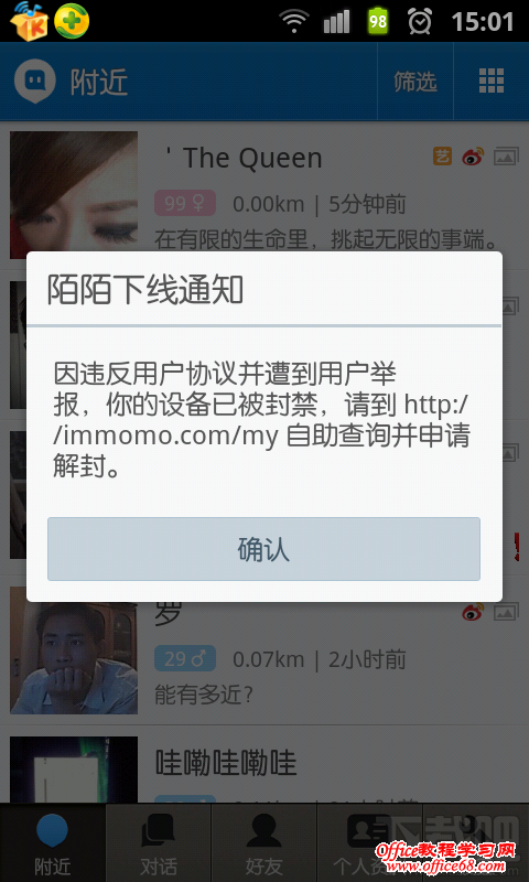 突然有一天打开陌陌,刚登陆没一会,就被迫下线了。提示"因违反用户协议并遭用户举报,你的设备已被封禁"。看到这里心都碎了,怎么突然会出现这个提示呢?这个小编也不好说,现在想办法看能不能解封或者怎么解决吧。