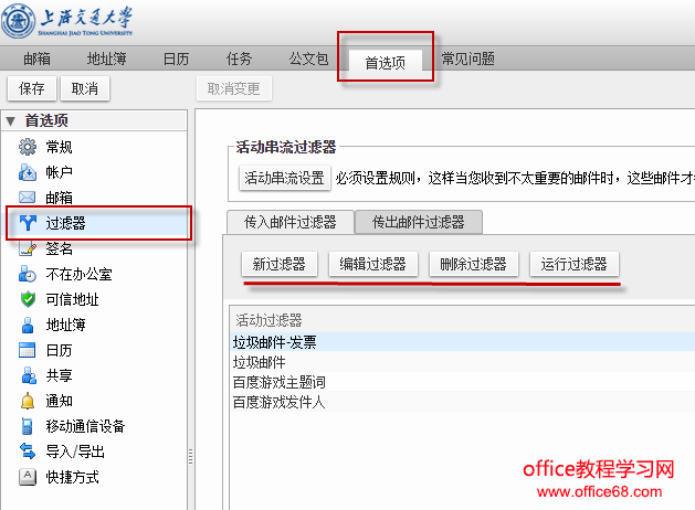 1、首先登录webmail (http://mail.sjtu.edu.cn) 点击上方菜单中的“首选项”; 然后再选择点击左侧菜单中的“过滤器”; 在“传入邮件过滤器”中 (注意啊,除了“传入邮件过滤器”外,还有“传出邮件过滤器”。“传入”和“传出”,就是“接收”和“发送”的意思。因为我们针对收到的“垃圾邮件”做规则匹配,所以选择“传入邮件过滤器”) 点击“新过滤器”,如下图。