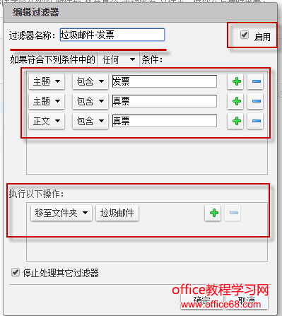 2、编写“过滤器”规则。 就本例来说,非常简单。如下图: “主题”或者“正文”中包含有“发票”、“真票”这两个词,作为“垃圾邮件”匹配条件。 下方的“执行以下操作”,选择匹配后的操作。 下图中的设置是“移动匹配邮件到垃圾邮件箱”。 因为考虑到可能存在误杀情况,所以暂存到“垃圾邮件箱”比较妥当。