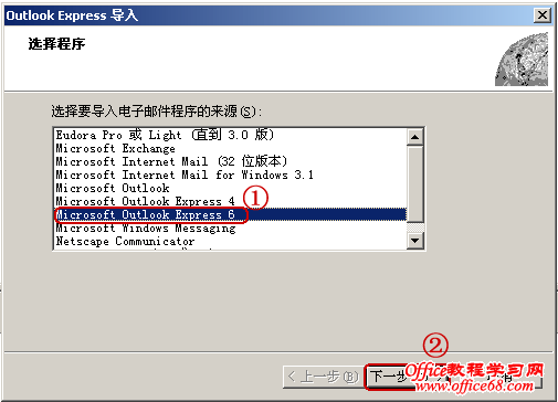 在弹出的对话框中选择Microsoft Outlook Express 6,点击“下一步”;