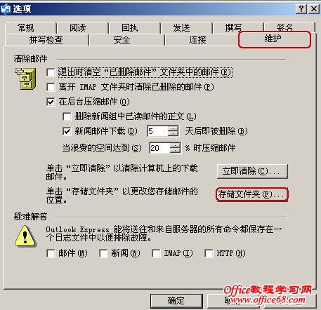 首先打开outlook express ,点击“工具”,“选项”,点击“维护”标签;