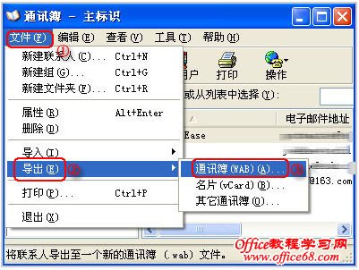 方法:打开Outlook Exrpess 点击通迅录,然后点击“文件”菜单,点击“导出”,选择通录簿(WAB)(A)...