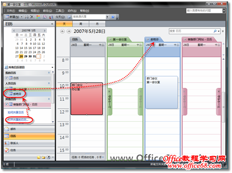 3)返回到Outlook,在“日历”导航窗格中增加了其他用户的“日历”选项,并且在日历视图中可以看到该用户的日程安排,如图2所示。