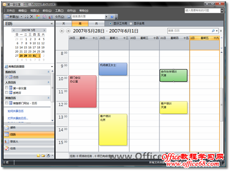 1)打开Microsoft Outlook 2007,在左侧的导航窗格中单击【日历】按钮,切换到日历视图,此时您将看到自己的日程安排信息,如图1所示。