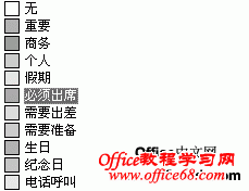 图2中的提醒设置主要有“标签”、“提前”和“时间显示为”三项。打开“标签”框右侧的下拉列表(图3),可以根据需要从中选择提醒标签的颜色,从而说明当前安排的提醒的重要性。接着选中图2中的“提醒”,打开“提前”下拉列表,从中选择出席会议需要提前的时间。假如你需要电脑播放音乐进行提醒,可以单击图2中的小喇叭图标,打开对话框选择到达提醒时间时播放的音乐文件。为了避免工作日程之间发生冲突,可以打开“时间显示为”下拉列表,从中选择当前的日程安排状态(闲、暂定、忙和外出)。