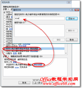 图6 设置收件人电子邮件地址中包含的特定词语 (7)依次单击【添加】、【确定】、【下一步】按钮,直至“完成规则设置”步骤,单击【完成】按钮即可完成设置,如图7所示。