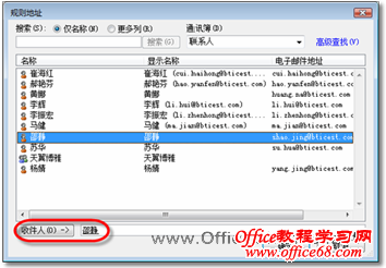 图4 选择进行分类的邮箱地址 (5)单击【确定】按钮返回“规则向导”对话框,此时收件人名称便加入到“步骤2:编辑规则说明(单击带下划线的值)”选项区域中,单击【指定】超链接,在打开的“规则和通知”对话框中选择收件箱下的“sina”文件夹,如图5所示。