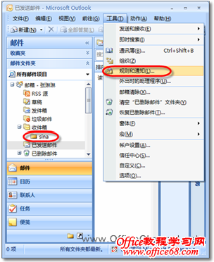 默认情况下,Outlook会将所有发件人的邮件混合放在一起,随着邮件数量的不断增加邮件管理的难度也随之加大,那么是否可以为让邮件按照指定的规则进行自动分类呢?接下来,将和大家一起来探讨如何在Outlook中实现对邮件信息的自动分类。 (1)在Outlook 2007收件箱下建立文件夹,如“sina”,用来存放相应账号的邮件。然后执行【工具】|【规则和通知】命令,如图1所示。