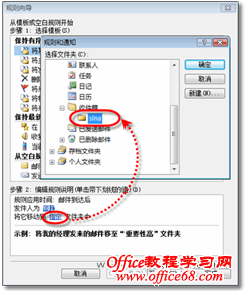 图5 选择新建的分类文件夹 (6)单击【确定】按钮后再单击【下一步】按钮,返回“规则向导”对话框。在“步骤1:选择条件”选项区域中选中“收件人电子邮件地址中包含”复选框,在“步骤2:编辑规则说明(单击带下划线的值)”选项区域中单击【特定词语】超链接,在打开的“查找文本”对话框的“指定在收件人电子邮件地址中要搜索的字词或短语”文本框中输入“sina”,如图6所示。