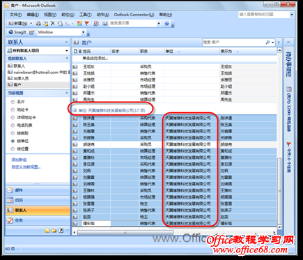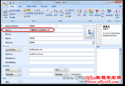 图1 按单位查看联系人 (2)双击其中一个联系人将其打开,为其添加“单位”属性信息,如图2所示。