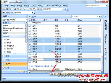 图2 为其中一个客户添加“单位”属性 (3)在“联系人”选项卡的“动作”选项组中,单击【保存并关闭】按钮,此时可以看到联系人中新增加了一个新的分组。按住【Ctrl】键逐个选中所有来自同一单位的客户,将其拖动至该分组(如图3所示),即可批量为这些联系人添加相同的“单位”属性,如图4所示。