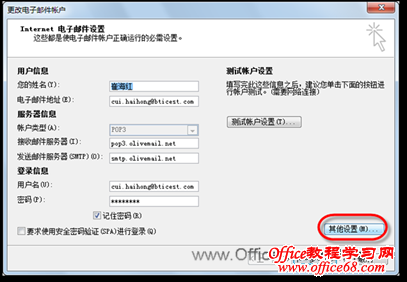 3)在打开的“更改电子邮件帐户”对话框中,单击【其他设置】按钮,如图3所示。