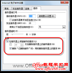 4)在打开的“Internet电子邮件设置”对话框中,切换到“高级”选项卡,然后选中“在服务器上保留邮件副本”复选框,当然,用户还可以根据实际需要选择其下的其他复选框,以便更灵活地控制服务器上邮件的删除情况,如图4所示。