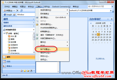 1)在已经设置好用户帐户的Outlook 2007中,执行【工具】|【帐户设置】命令,如图1所示。