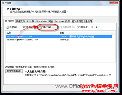 2)在随即打开的“帐户设置”对话框中,选中需要更改的账户,然后单击【更改】按钮,如图2所示。