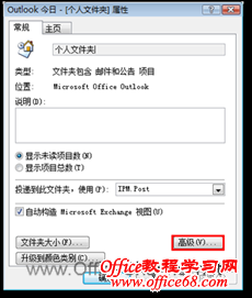 图1 执行【个人文件夹属性】命令 (2)在“Outlook今日-[个人文件夹]属性”对话框的“常规”选项卡中单击【高级】按钮,如图2所示。