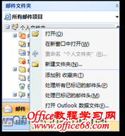当用户将电子邮箱的帐户添加到Outlook中时,就意味着让Outlook全权负责该邮箱的所有邮件处理工作,其中也包括保管登录邮箱的密码。如果用户的计算机是一台公用计算机,那么,就需要具备保护电子邮箱帐户的措施,加密Outlook数据文件就是一个不错的方法。要为该数据文件加密,可以执行如下操作步骤。 (1)打开Outlook 2007应用程序,在“导航窗格”中右键单击“个人文件夹”,在随后打开的快捷菜单中执行【个人文件夹属性】命令,如图1所示。