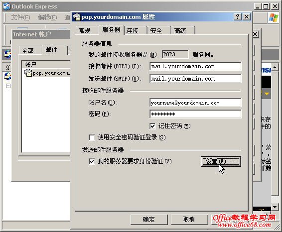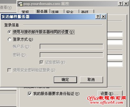 设置SMTP服务器身份验证: 在“邮件”标签中,双击刚才添加的帐号, 弹出此帐号的属性框;请点击“服务器”标签,然后在下端“发送邮 件服务器”处, 选中“我的服务器要求身份验证”选项, 并点击右边“设置”标签, 选中“使用与接收邮件服务器相同的设置”。
