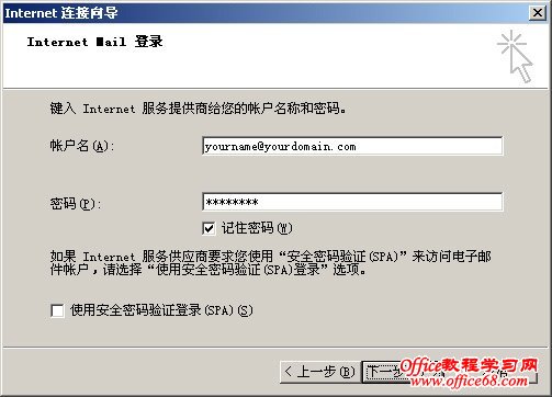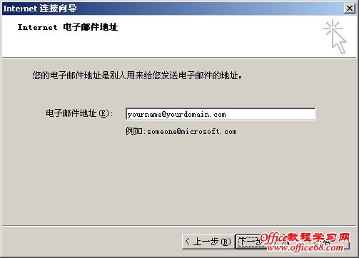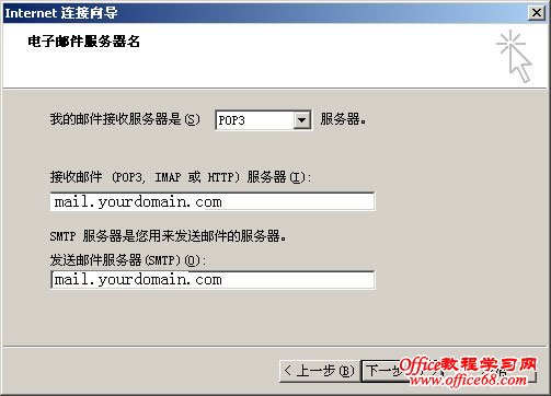 输入您邮箱的的pop和SMTP服务器地址: pop3服务器:mail.yourdomain.com smtp服务器:mail.yourdomain.com 再点击“下一步”;