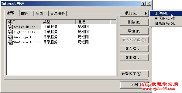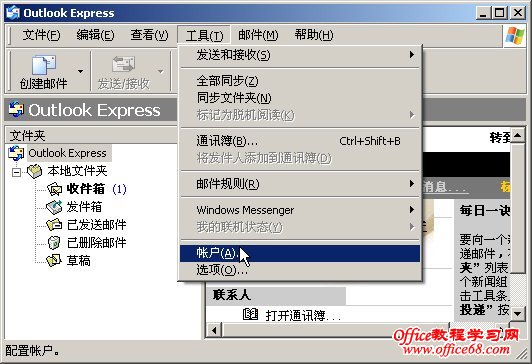 以中文版Outlook Express 6为例: 打开Outlook Express后,单击窗口中的“工具”菜单,选择“帐户”