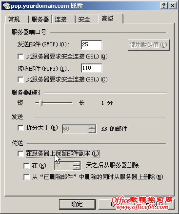 如果您想在用outlook收信的同时在服务器邮箱中保留邮件副本,在帐号的属性中点击“高级”标签,选中“在服务器上保留邮件副本”选项。(建议不要保留,以免信箱用完后无法及时收到新邮件!)