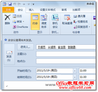 3. 在随即打开的新建会议窗口中,系统已自动将小组成员的收件地址填充到了“收件人”文本框中,同时也安排好了会议的召开时间,如3所示。