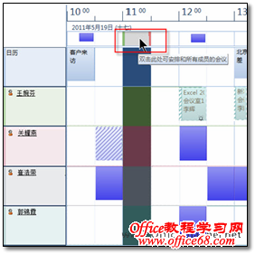 2. 此时,在右侧的“日程安排视图”中,可以快速查找到小组成员的空闲时间,鼠标双击空闲时间顶部的单元格,即可安排和所有成员的会议,如2所示。