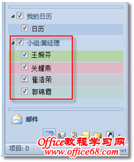 1. Outlook 2010“日历”窗口中,选中自己的日历,以及所有小组成员的日历,如1所示。