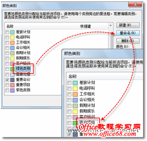 2. 在随即打开的“颜色类别”对话框中,选中需要进行重命名的类别,单击【重命名】按钮,删除该类别的原名称并输入新名称,按【Enter】键后完成重命名,如4所示。