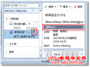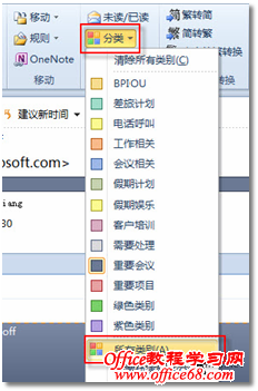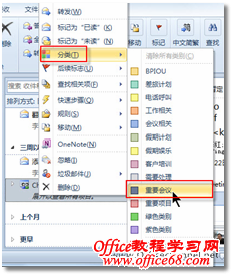 1. 对于收件箱或任何邮件列表中的邮件,可以右键单击该邮件,指向“分类”选项,然后单击某个颜色类别,如“重要会议”,如1所示。