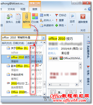 2. 在“搜索工具”的“搜索”上下文选项卡的“优化”选项组中,单击【有附件】按钮,即可快速地在当前搜索结果的基础上,过滤出所有包含附件的邮件信息,如2所示。