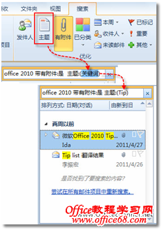 3. 在“搜索工具”工具中,提供了更多优化选项,如发件人、主题、已分类等等,您可以根据个人需要轻松添加更多搜索条件,从而让搜索结果更精确,目标信息更易找到,如3所示。