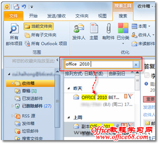 Outlook 2010提供的即时搜索功能,在所有Outlook文件夹(例如,“邮件”、“日历”、“任务”和“联系人”)中都始终可用,所以不管搜索什么内容,均可快速达到目的。本文以搜索目标邮件为例进行介绍。
